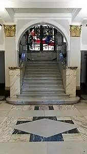 Internally, the principal rooms were the council chamber and committee rooms on the first floor; the main staircase, which was made from marble, was illuminated with a stained glass window, designed by the architect and installed by William Meikle & Sons, depicting King Alexander II presenting a charter to burgh officials in 1226.[12]