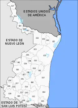 Tamaulipas is a state in Northeast Mexico that is divided into 43 municipalities. According to the 2020 Mexican census, it is the fourteenth most populated state with 3,527,735 inhabitants and the sixth largest by land area spanning 80,249.3 square kilometres (30,984.4 sq mi).[1][2]