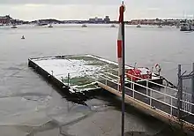 Moored at the quay is the Helikopterplattan (Helicopter Platform). In addition to being the only helicopter platform in central Stockholm, it has been known since the mid-1980s as a favourite hangout for white power skinheads and other far right activists.[2][3][4]