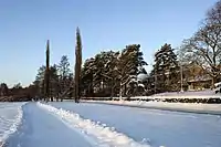 In the 1930s building regulations in Munkkiniemi had to be remade, because the new law didn't allow closed blocks anywhere else than in towns. This led to many problems because properties had already been sold. The effects can be seen around Munkkiniemi Avenue, where the otherwise closed blocks are open towards the south. It was during this time 1936-1938 that Munkkiniemi expanded really fast. 5 000 new housing rooms were built, especially around the avenue and by Laajalahti Bay and 150 million marks in building loans were issued in the municipality. After a few complaints and uncertainties about the building regulations Munkkiniemi was put into a building ban in October 1938 and it was extended many times until the end of World War II. One reason for the ban was the “water crisis” of 1938.[1]