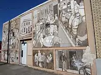 Estacada, Oregon has an extensive collection of public murals. According to 1859's Catie Joyce-Bulay, the city displayed 21 murals, as of 2018. Among them are paintings depicting a Native American tribe fishing at Celilo Falls, a person foraging mushrooms in a forest, and Chinese Americans harvesting ginseng.[1]