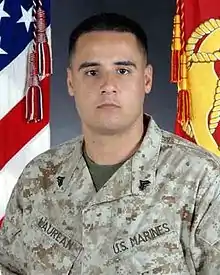 Marine Corporal Cesar Laurean (SEH'-sahr LOHR'-ee-uhn), the 21-year-old prime suspect in the case, is the man whom Lauterbach accused of sexually assaulting her.[14] A federal warrant for unlawful flight to avoid prosecution was issued for his arrest on January 12, 2008.[12] The Federal Bureau of Investigation and the Naval Criminal Investigative Service issued a wanted flier on him. There was also a $25,000 reward offered by the FBI and $5,000 from the state of North Carolina for information leading to his capture.[15] Onslow County has primary jurisdiction, but the Judge Advocate General's office may bring charges as well, to include but not limited to charges stemming from Laurean's deserter status.[15]