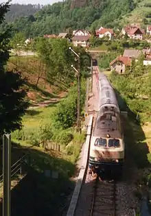 In 1995, the timetable was improved by the introduction of an approximately hourly service. Similarly, DMUs were largely replaced with locomotive-hauled trains.[9] In addition until the mid-1990s, some D-trains or InterRegio trains also ran on the line; these were important for the tourism from the Ruhr area to the northern Black Forest.