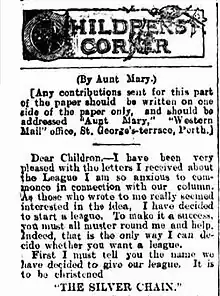 It was at the invitation of John Winthrop Hackett that Chase became "Aunt Mary" on his Western Mail newspaper. Chase first proposed the idea of silver chain in "Aunt Mary's Children's Corner" in the Western Mail on 3 June 1905.[3] She suggested that her "nieces and nephews" made "silver links" of service to help poorer children in Western Australia. The children paid an annual subscription of a shilling and this funded Christmas presents that year. The idea expanded and it was soon funding its first District Nurse.[4][1] The first nurse was briefly Sister Copley[3] before Sister Frances Cherry replaced her. Sister Cherry was to help the service and was employed until her death in 1941.[1]