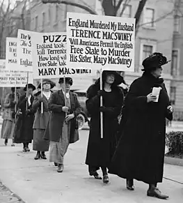MacSwiney's daily life remained held in this pattern until Terence's final hunger strike, which he began in the summer of 1920. Terence had become Lord Mayor of Cork in March 1920 and he began the highest-profile member of the 1920 Cork hunger strike, which became an internationally known news event. Although offering Terence daily support, MacSwiney also petitioned the newly emergent Irish Republican Army to call Terence off the strike. Although Muriel later claimed publicly to have fully supported the strike, her private fears about it caused her to conflict with her sister-in-law Mary MacSwiney, a fellow activist who urged Terence to see out the strike. Terence died due to his hunger strike on 25 October 1920.[2][3][4][5][6][7][8] In the aftermath, Muriel was the only member of Terence's family to attend a British-run inquest into his death, which caused more infighting. Muriel was physically unable to return to Ireland for the funeral, which was attended by 10,000s of mourners.[1]