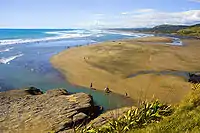 Muriwai Beach has black sand, caused by the iron content derived from the ancient volcanoes in the area, including the large Kaipara Volcano which was situated offshore from the Kaipara Heads, and erupted 23-16 million years ago.[14] The black sand is moved up the west coast of the North Island by longshore drift.