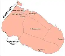 The okrug was established on August 1, 1927, when the All-Russian Central Executive Committee (VTsIK) issued two Resolutions: "On the Establishment of Leningrad Oblast" and "On the Borders and Composition of the Okrugs of Leningrad Oblast".[1] According to these resolutions, Murmansk Governorate was transformed into Murmansk Okrug and included into Leningrad Oblast[1] together with eight other okrugs.[2] The okrug was not contiguous with the rest of Leningrad Oblast and was separated from it by the territory of the Karelian Autonomous Soviet Socialist Republic.[3]