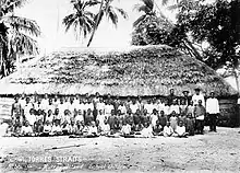 Missionaries (mainly Polynesian) and some other Polynesians began to settle the island in 1872 when the London Missionary Society founded a missionary school there.[11] The Queensland Government annexed the islands in 1879. The Australian painter Tom Roberts visited the island in 1892.[12] He witnessed a nighttime dance and depicted it in a painting.