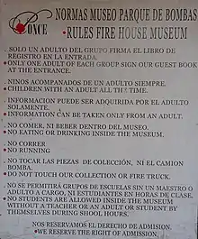 The station continued to serve the city of Ponce until 1990, ending its 108-year history as an active fire station. On that year, the station's fire-fighting duties were transferred to the more spacious fire station at Calle Cristina and Calle Mayor streets, and the building was officially converted into a fire-fighting museum. The restoration of the building into a museum took place under the guidance of Pablo Ojeda O'Neill, an experienced local museum curator.[13] Restoration cost was US$140,000.[14] Nowadays, a photo of the 1883 firefighters hangs on the walls of Museo Parque de Bombas. In 1983, the 100th anniversary of the brigade's victory over the infamous fire was commemorated at the station. Various artifacts used by the 1882 fire brigade are on display at the museum. Among these are some artifacts used to combat the 1899 "El Polvorín" fire. There are also artifacts of historical significance. Even before its 1990 closure, the station had already become a major tourist attraction, and some of the firemen would give visitors free station tours voluntarily when they were not attending to emergencies. The Ponce firefighters' museum is still known generally as Parque de Bombas and, according to some estimates, it is one of Ponce's most visited tourist attractions.[15]