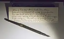 There is a note with the pen on which is written (In German): 'This pen has been used for years by Einstein, especially during the time between 1912 and 1921 – So that all his designs and calculations relating to general relativity and gravity from this time period are written with this pen. He gave this pen to me in 1921. P. Ehrenfest. '[35]