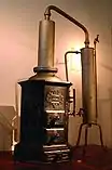 In the room hangs a painted portrait of van 't Hoff. His golden Nobel prize medal, and a lab journal are also shown. Also a variety of elementary equipment for a chemical laboratory: a distilling apparatus for water (1860), dilatometers, thermometers, hydrometers, alcohol meters, an oleometer, a colorimeter (1880), pycnometers (some with thermometer), pipettes, burettes, volumetric flasks, a boiling flask, a spectral burner and spectroscope (1880), polarimeters, a kipp generator (1850), sample collections of experimental chemicals (some in wooden boxes), an evaporating basin, gas burners, an oxyhydrogen voltmeter, apparatus for electrolysis, an analytical balance, cork presses, a refractometer (1910), a flash point apparatus for petroleum, a circular slide rule.