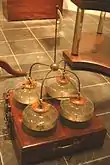 Also large (from today's perspective) devices, mostly made from wood and copper, to measure and display electricity (1900–1930): volt meters, a resistance box, radio valves, a universal bridge, mirror galvanometers, a quadrant electrometer .