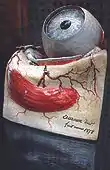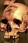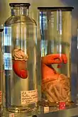 The room shows a reconstruction (1988) of the Theatrum Anatomicum (anatomical theatre) (built 1596). A richly decorated instrument chest (1670) which belonged to the Leiden surgeon's guild. A small collection of objects (largely Egyptian antiquities) that survived from the now gone Leiden Theatrum (one of the oldest museums of Europe ) are shown as well. On the wall three paintings: one depicting the magistrates of the Catharina and Caecilia Hospitals (the latter now houses the museum), a second showing a Prussian peasant from whom a 10-inch sword, swallowed in a drinking bout, has surgically been removed, a third showing renowned surgeon and designer of medical instruments Cornelis Solingen (1680). One of Solingen's inventions (part of the collection) was a screw to unindent a soldiers skull who had been hit by a bullet. Often in those days bullets did not fully penetrate a skull, merely deformed it.[12]