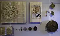 Also shown are a large set of mathematical instruments to measure angles: sectors, a protractor and beam compass.