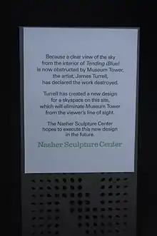 A sign posted in the sculpture garden of the Nasher states that "Because a clear view of the sky from the interior of Tending (Blue) is now obstructed by the Museum Tower, the artist, James Turrell, has declared the work destroyed."
