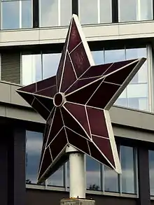 The museum, a branch of the national art gallery,[6] has a display of socialist regime of 45 years (1944–89) period of art symbols and other artifacts and archives with statues in the park.[2] The museum covers an area of 7,500 square metres (81,000 sq ft) in the Sofia suburb known as "Red Star". It consists of three parts: a park in which 77 statues or sculptures drawn from the communist period, including a statue of Vladimir Lenin, have been erected; an exhibition hall with 60 paintings and 25 easel paintings representations; and a media or video hall in which propaganda films and newsreels related to the communist period are screened. There is also a souvenir kiosk where communist period memorabilia are sold.[3][4][7] The museum's collection covers the period from 1944 to 1989, from the introduction of communism to Bulgaria to the end of the totalitarian regime.[3] At the entrance of the museum stands a large "five-pointed star" which had earlier adorned the Party House in Sofia from 1954 to 1984. The statue park, which is said to be the "most representative part of the museum", features statues, busts, and figures of popular communist leaders and activists, of poets, sculptures of Red army soldiers, agricultural and industrial workers, and so forth.[3]