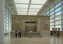 Designed by the American architect Richard Meier and built in steel, travertine, glass and plaster, the museum is the first great architectural and urban intervention in the historic centre of Rome since the Fascist era.[1] It is a structure with a triumphal nature, clearly alluding to the style of imperial Rome. Wide glazed surfaces allow the viewer to admire the Ara Pacis with uniform lighting conditions.[2]