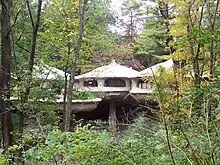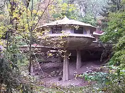 The Mushroom House or Pod House is a contemporary residence in the town of Perinton, New York, which has been featured in television programs (notably HGTV's Offbeat America series)[2] and books (notably the Weird U.S. series)[3] due to its whimsical appearance. Patterned after umbels of Queen Anne's Lace, its brown color is more suggestive of mushrooms.[4] The house was constructed for attorney-artist couple Robert and Marguerite Antell between 1970 and 1972 and was designated a town landmark in 1989.[5]