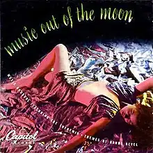 Music Out of the Moon was noteworthy for being one of the first albums to feature a full color cover – a risqué photograph by Paul Garrison of partially clothed actress Virginia Clark of the Earl Carroll Theatre, Hollywood,[5] sprawled across a bed – which made it stand out in an era of monochrome album packaging.
