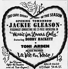 The success of Music for Lovers Only resulted in Gleason’s public debut as bandleader on February 12, 1953, at the La Vie en Rose nightclub in New York City, wherein he performed the music from the album in a program shared with Toni Arden. Gleason said he did it as a favor to his friend Monte Proser, the club's proprietor.[43][44] "Monte has this club that needs unusual attractions because he's keeping it out of the usual entertainment rut and he said he thought my band could do some business for him," Gleason said. "Monte's done some things for me in the past. I couldn't turn him down."[13] He later recalled that he found the experience of conducting an orchestra in person "tough" and, because of his inability to read music, was required to memorize 28 different arrangements.[20] Among those who attended Gleason's debut were Steve Allen, Milton Berle, Johnnie Ray, and Jackie Coogan.[45]
