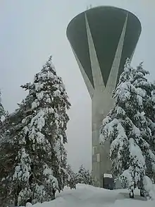 Mustankallio water tower lies in the Kiveriö district of Lahti, Finland, and stands 50 metres (160 ft) tall. Completed by a local company in 1963, it includes two water reservoirs, a penthouse meeting facility complete with sauna, and a viewing platform. The design, which features pre-stressed concrete elements and asbestos cement cladding, was a departure from the steel water tower structures commonly built in the region. When commissioned, its original name was the Metelinmäki Water Tower. It has been described as crocus-like in appearance and complimented on its elegance.