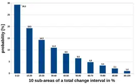 Distribution of probabilities for k=10 sub-areas of the total change interval. The sub-areas each cover 1/k of the width of the total change interval.
