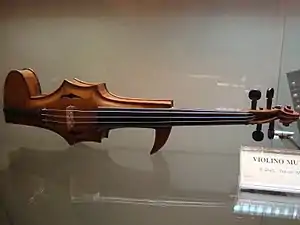 A mute violin, built by P. Grulli at the end of the 19th Century, in the collection of the Museo Nazionale degli Strumenti Musicali in Rome. This particular mute violin resembles an electric violin
