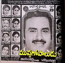 Muvva Gopaludu is a 1987 Indian Telugu-language romantic drama film produced by S. Gopala Reddy and directed by Kodi Ramakrishna. The film stars Nandamuri Balakrishna, Vijayashanti and Shobana, with music composed by K. V. Mahadevan. It is a remake of the Tamil film Aruvadai Naal (1986).[1] The film was released on 19 May 1987.[2]