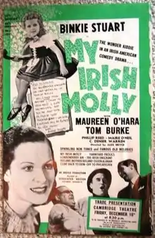 My Irish Molly is a 1938 British musical film, directed by Alex Bryce and starring Binkie Stuart, Tom Burke and Maureen O'Hara shot at Welwyn Studios with footage of Ireland.[1][2] The screenplay concerns a young orphan who runs away from her mean-spirited guardian to live with her aunt. O'Hara appeared in the film under her real name of Maureen FitzSimmons.[3] The film was released in the US in 1940 under the title My Little Molly with scenes of Binkie Stuart removed due to Maureen O'Hara being given top billing due to her American popularity.