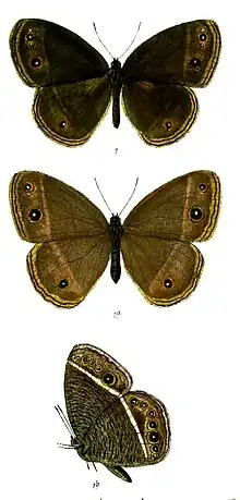 This species is very similar to Mycalesis nicotia. It differs only in the conspicuously darker ground colour of the underside, in having the tuft of hairs that overlies the sexual patch of specialized scales on the upperside of the hindwing in the male brown not black, and in the sex-mark on the underside of the forewing being larger and much paler in colour. These differences, slight as they are, seem constant through a series.