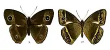 Wingspan is about 56mm. Dorsal surface is dark brown with two eyespots at the sub marginal area. Lower eyespot is large, prominent and ringed with orange. Ventral surface is dull orange brown.[3] Larval host plants include Ochlandra stridula[4] and Bambusa species.[5]