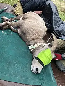 In July 2007, this species of Mycoplasma was linked to the deaths of Bighorn sheep in the Western United States.[6][7] M. ovipneumoniae is also a predominant bacterium associated with broncopneumonia lesions in free-ranging bighorn lambs.[7] Introductions come from either domestic sheep and goats (which harbour M. ovipneumoniae with limited morbidity), or through contact with other infected bighorn sheep which survived initial infection events to become long-term chronic carriers. Transmission comes from animal secretions or respiratory droplets.[1] There have been a minimum of thirteen studies where bighorns and domestic sheep were penned together, resulting in 98% bighorn mortality rates.[3] The cause of the issue is when domestic sheep and goats that are infected with M. ovipneumoniae come into contact with healthy bighorn sheep, this infects them and can cause large population die-offs.[7]