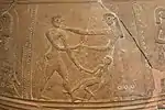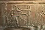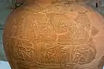 The Mykonos vase, a pithos, is one of the earliest dated objects (Archaic period, c. 675 BC) to depict the Trojan Horse from Homer's telling of the Fall of Troy during the Trojan War in the Odyssey.[1] It was found in 1961 (with human bones inside) on Mykonos, the Greek island for which it is named, by a local inhabitant. Ìt is on display at the Archaeological Museum of Mykonos. [2]