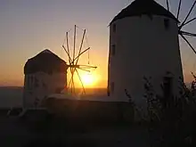 The Mykonos windmills are an iconic feature of the Greek island of the Mykonos. The island is one of the Cyclades islands, which neighbour Delos in the Aegean Sea. The windmills can be seen from every point of the village of Mykonos, the island's principal village, which is frequently called the Chora (which translates to "Country" in Greek, but refers to an island's "Town") on Greek islands. The windmills are the first thing seen when coming into the harbour of Alefkandra, as they stand on a hill overlooking the area. Most windmills face towards the North where the island's climate sources its strongest winds over the largest part of the year. There are currently 16 windmills on Mykonos of which seven are positioned on the landmark hill in Chora. Most of them were built by the Venetians in the 16th century, but their construction continued into the early 20th century. They were primarily used to mill wheat. They were an important source of income for the inhabitants. Their use gradually declined until they ceased production in the middle of the 20th century. The architecture of each of them is similar, all have a round shape, white colour and a pointed roof and very small windows. Such windmills are found in almost all Cyclades islands. One of these windmills has been transformed into a museum. The whole village of Chora and part of the harbour are visible from this point.
