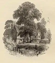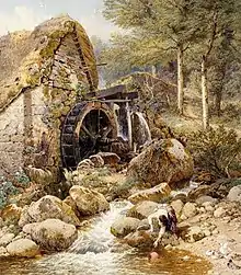 Although he had painted great numbers of landscape scenes from Scotland to the Mediterranean, it was after moving to Witley that Birket Foster produced the works for which he is best known—a sentimentalised view of the contemporary English countryside, particularly in the west Surrey area. Although criticised for their idealised view of rural life, they were recognised for their detail and execution. Birket Foster's work (along with that of other artists) was used by Cadburys, the chocolate manufacturer, on the cover of their chocolate boxes from the 1860s onwards.[5] Printed in 1861, The Carewes: a tale of the Civil Wars was the swashbuckling royalist family history of a gentry on the edge of Windsor Forest, illustrated with fine images and a dashing flourish; it was much appreciated in America. "the dainty water-colour drawings executed...appeal to the majority of the British public more than the works of any other." So wrote H.M. Cundall in 1906 in the preface to a first biography.[6]