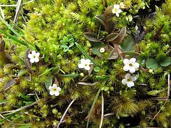 Myosotis bryonoma Meudt et al. is in the plant family Boraginaceae and was originally described in 2018 by Heidi Meudt, Jessica Prebble and Michael Thorsen.[3][2] It is morphologically most similar to M. tenericaulis, another creeping, bracteate-prostrate species of Myosotis, and also shares some morphological characters with other bracteate-prostrate species, M. colensoi and M. cheesemanii.[2] It can be distinguished from M. tenericaulis by its shorter (<5 mm long) and wider (>0.7 mm) petioles, smaller leaves (generally <6 mm long), appressed trichomes that are parallel to the mid vein, rosette leaves that are glabrous on the underside, shorter inflorescences (10–45 mm long) and internodes (<5 mm), and fewer flowers per inflorescence (1–3).[2] M. bryonoma can be distinguished from M. colensoi and M. cheesemanii by its shorter rosette leaf petioles (< 4 mm long), shorter calyces (< 3.5 mm long at flowering), calyx lobes which are longer than half the length of the calyx, rosette leaves usually glabrous abaxially, and shorter corolla tube (< 4.3 mm long).[2]