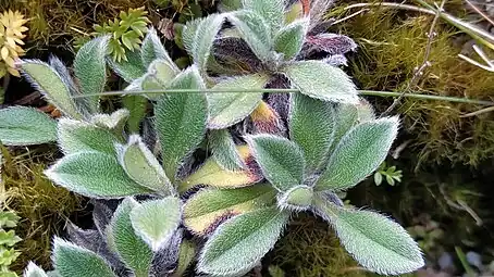 Myosotis saxosa is a forget-me-not originally collected from Titiokura, Hawkes Bay, North Island, New Zealand.[4] Some specimens collected in other areas Hawkes Bay, East Cape (Hikurangi) and even on the South Island have been variously identified as M. amabilis or M. saxosa,[13][3] and the two species require taxonomic revision.[9] Recent efforts to relocate plants at some North Island localities have been unsuccessful.[9]