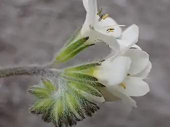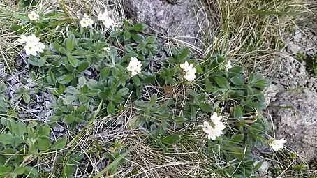 Myosotis saxosa plants are rosettes. The rosette leaves have petioles that are about as long as the leaf blades. The rosette leaves are about 20–30 mm long by 5–10 mm wide (length: width ratio c. 2–6: 1), and the leaf blade is broad-ovate to obovate, widest below, at or above the middle, with an apiculate apex. Both surfaces of the leaf are uniformly and sparsely to densely covered in patent to erect hairs. On the upper surface of the leaf, these hairs are always antrorse (forward-facing) whereas on the lower surface, they can be either antrorse or mostly retrorse (backward-facing). Each rosette has several ascending to erect, ebracteate inflorescences that are up to 70 mm long. The cauline leaves are similar to the rosette leaves, but are smaller, elliptic, and subacute to acute, and have hairs similar to the rosette leaves but more appressed. The flowers are about 12 per inflorescence, and each is borne on a short pedicel, without a bract. The calyx is about 5 mm long at flowering and fruiting, lobed to one-half tor more of its length, and densely covered in appressed hairs, as well as some patent hairs, all of which are mostly antrorse. The corolla is white and 7–13 mm in diameter, with a cylindrical tube, and small scales alternating with the petals. The anthers are exserted, surpassing the faucal scales. The nutlets are c. 2.2 mm long by 1.3 mm wide.[4]