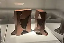 In her series Bisections, Encasements, Mimlitsch-Gray plays with the history of decorative objects and our modern relationship to them. Rather than make a chalice, candlestick, or other item common to traditional silversmithing or hollowware, Mimlitsch-Gray creates negative impressions of these objects which are split into two equal halves and embedded in wooden or metal block forms inspired by shaker design.[15] Stripped of their functionality, these pieces transcend their objecthood to begin functioning as images signifying the shifting cultural attitude towards these types of traditional objects and traditional forms of making.[16] Art Historian Jenni Sorkin wrote, "The imprint of the object is memorialized as an indexical relationship to its usage, its impression a permanent rendering while simultaneously documenting the form’s disappearance… In Mimlitsch-Gray's Bisections/Encasements, the objects are perfect specimens of a past that has been deconstructed, a mediation on the disappearance of skilled labor, and the illusory quality of the objects it produced."[15] Sugar Bowl and Creamer III from this series is held in the permanent collection of the Renwick Gallery, Smithsonian Institution.[17]