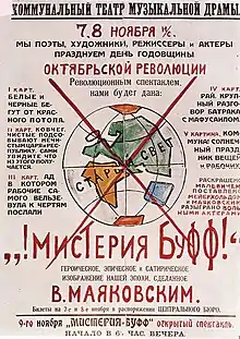 Mystery-Bouffe (Russian: Мистерия-Буфф; Misteriya-Buff) is a socialist dramatic play written by Vladimir Mayakovsky in 1918/1921. Mayakovsky stated in a preface to the 1921 edition that "in the future, all persons performing, presenting, reading or publishing Mystery-Bouffe should change the content, making it contemporary, immediate, up-to-the-minute."[1]
