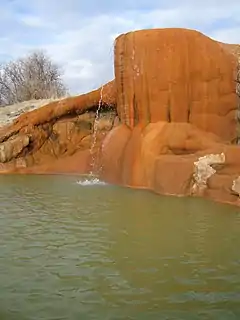 The hydrothermal system is located within the zone of activity of the Sevier Fault.[5] The geothermally heated water has mixed with minerals in the surrounding rocks, creating rust-colored travertine terraces.[6]