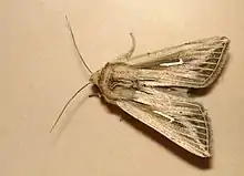 Mythimna l-album, the L-album wainscot, is a moth of the family Noctuidae. The species was first described by Carl Linnaeus in his 1767 12th edition of Systema Naturae. It is distributed throughout Europe, but is also found in North Africa from Morocco to Tunisia and in the Levant, then east across the Palearctic to Central Asia. It is not found in the far north of the Arabian Peninsula. The limit in the north varies. It occurs on the northern edge of the range as a migrant. From southern England, then Denmark and southern Scandinavia, the north limit cuts across the Baltic Sea across the Baltic states then south of Moscow to the Urals.
