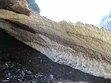 Névé /neɪˈveɪ/ is a young, granular type of snow which has been partially melted, refrozen and compacted, yet precedes the form of ice. This type of snow is associated with glacier formation through the process of nivation.[1] Névé that survives a full season of ablation turns into firn, which is both older and slightly denser. Firn eventually becomes glacial ice – the long-lived, compacted ice that glaciers are composed of.[2] Glacier formation can take years to hundreds of years depending on freeze-thaw factors and snow compaction rates.[3] Névé is annually observed in skiing slopes, and is generally disliked as an icy falling zone.