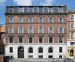 No. 12 is home to the Danish Union of Professional Technicians (TL). The building is the former headquarters of the glass manufacturer Kastrup Glassworks. It was designed by Phillip Smidth and built between 1892 and 1895.[6] The Iron Manufacturers' House at No. 30 from 1904 was designed by Gotfred Tvede. The building with the rounded corner at No. 32–34 is from 1939 and was designed by Povl Baumann.[7] No. 50 is from 1828 and has since 1900 been part of the theatre Folketeatret whose main entrance is on Nørregade.[8] The headquarters of the DaneAge Association is located at the corner of Nørre Voldgade and Nørregade. The building on the corner of Nørre Voldgade (No. 76) and Fiolstræde is the former Merchants' Academy, now Niels Brock Copenhagen Business College. It was designed by Valdemar and Bernhard Ingemann and opened in 1902.[9]