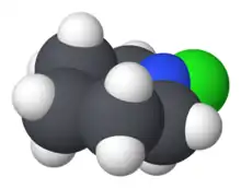 N-Chloropiperidine is the organic compound with the formula C5H10NCl. A colorless liquid, it is a rare example of an organic chloramine, i.e. a compound with an N-Cl bond. It is prepared by treatment of piperidine with calcium hypochlorite. Typical of chloramines, the compound is so reactive that it is generated and used in situ rather than being isolated. The compound undergoes dehydrohalogenation to afford the cyclic imine.[1]