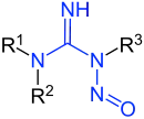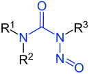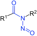 Nitrosamides are chemical compounds that contain of the chemical structure R1C(=X)N(–R2)–N=O, that is, a nitroso group bonded to the nitrogen of an amide or similar functional group.[1] Specific classes include the N-nitrosamides, N-nitrosoureas, N-nitrosoguanidines, and N-nitrosocarbamates. Nitrosamides are usually chemically reactive, metabolically unstable,[1] and often carcinogenic; however, in contrast to the N-nitrosamines, N-nitrosamides are not generally contaminants found in food.[1]