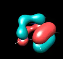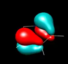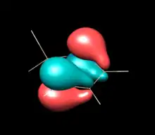 Computational studies and photoelectron spectroscopy create a more nuanced picture of electronic structure and π-electron sharing in NHSis. Relevant π bonding orbitals in unsaturated five-membered NHSis can be understood as the molecular orbital mixing of the diimine backbone's butadiene-like pi orbitals and the 3s and 3p orbitals of Si. Photoelectron Spectra of the unsaturated [tBuN−CH=CH−tBuN]Si: show a HOMO with three peaks at -6.96eV, -7.13eV & -7.28eV, assigned the in-phase overlap of the Si 3py orbital and buta-1,3-diene-like π3 of the diimine. The HOMO in the tetravalent Si-hydrogenated analog lacks a vacant Si 3py orbital and the energy of the π3 is destabilized to -6.56 eV, supporting charge donation from N to Si in the silylene. The HOMO-1 is the in-plane Si lone pair involved in σ donation. No difference is calculated between the HOMO-2 for the unsaturated silylene compared to the corresponding orbital of the silane analog. The original 1994 Denk at al. photoelectron spectroscopy communication relates this orbital to the π2 diimine orbital, however a 1996 paper from Blakeman et al. designates this as the nitrogen lone pairs. Either way, both orbital assignments are symmetrically forbidden from overlapping with any Si orbital. The HOMO-2 does not change in energy upon hydrogenation at Si indicating that much of the overall electronics are unchanged by hydrogenation and underscoring the effects of N to Si electron π-donation in the HOMO and HOMO-3. Calculations in the former study at the MP4 6-31G* level showed increased energy level spacing for N-H model compounds (instead of N-tBu), but with the same order and proportional spacing.[5][9] The Blakeman study compared the benzo-fused NHSi to the ethylene-like unsaturated NHSi, and found by PES that the HOMO is lower by .36eV and the Si lone pair by .34 eV in the benzo-fused NHSi, suggesting the electron withdrawing power of the phenylene ring makes the benzo-fused NHSi less nucleophilic.[9]