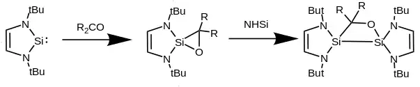 Generally, when reacting with unsaturated species an NHSi will add across a double or triple bond to form a spirocyclic compound, containing one or two equivalents of NHSi-derived silicon. Alkenes and alkynes react with NHSis only if their C-C bond is highly polarized such as is the case with phenyltrimethylsilylacetylene, which produces a silicocyclopropene with one NHSi equivalent or a disilicocyclobutene with two. With ketones two equivalents of benzo-fused NHSi react to form disilyloxetanes as well as further reaction products depending on the carbon substituents.