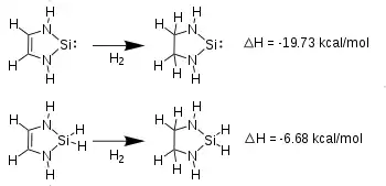 Several computational studies suggest aromatic delocalization over the unsaturated NHSi rings. DFT calculations of NHSi-phosphonyl radical adducts show far greater radical electron delocalization over the rings of unsaturated NHSis (14% Si, 65% ring) than the saturated NHSi (58% Si, 19% ring).[7] Aromaticity is further supported by calculated heats of hydrogenation. At the MP4/6-31G*//6-31G* level, hydrogenation at the carbon backbone of an unsaturated divalent silicon NHSi is 13 kcal/mole more exothermic than the corresponding hydrogenation of the tetracoordinate-silane analog. The stabilization of the divalent silicon ring, with an empty 3p orbital and in-ring lone pair, versus the tetravalent silane which lacks an empty Si 3p orbital indicates significant electronic communication between the silicon and the olefinic carbons.[5] Additionally, calculations of Nuclear Independent Chemical Shift of the ring-centered NMR resonances of [HN-CH=CH-NH]Si: at -10.2ppm indicate a high degree of delocalization about the unsaturated NHSi ring. In reference to the perfectly aromatic cyclopentadienyl anion's shift at -14.3ppm, NICS data supports the aromaticity of NHSis.[8]
