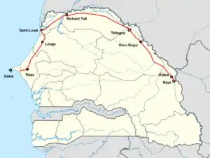 The N2 road is one of the national roads of Senegal. It connects the west and the east of the country in a large arc following the northern frontier from the outskirts of the capital Dakar via Thiès, Louga, Saint-Louis, Richard Toll, Thilogne, Ouro Sogui, Kidira and Nayé on the border with Mali.